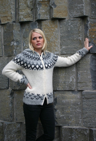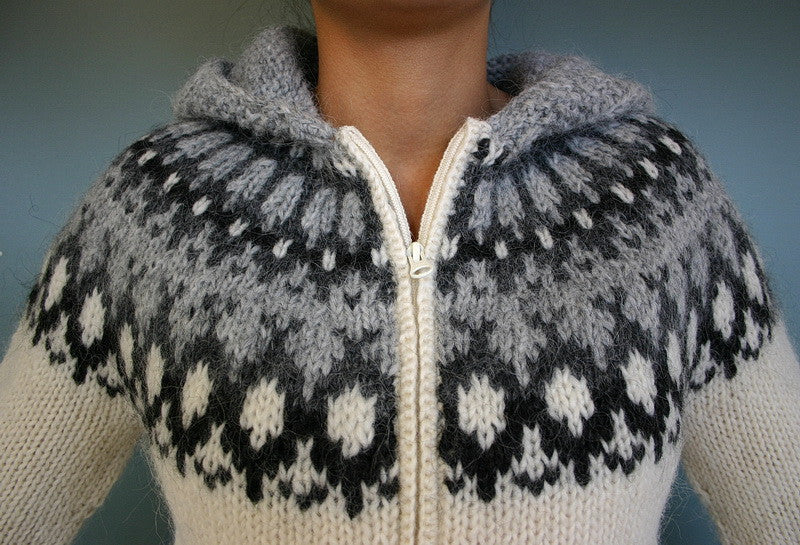 White wool cardigan with hood. Knitted from 100% Icelandic wool yarn.