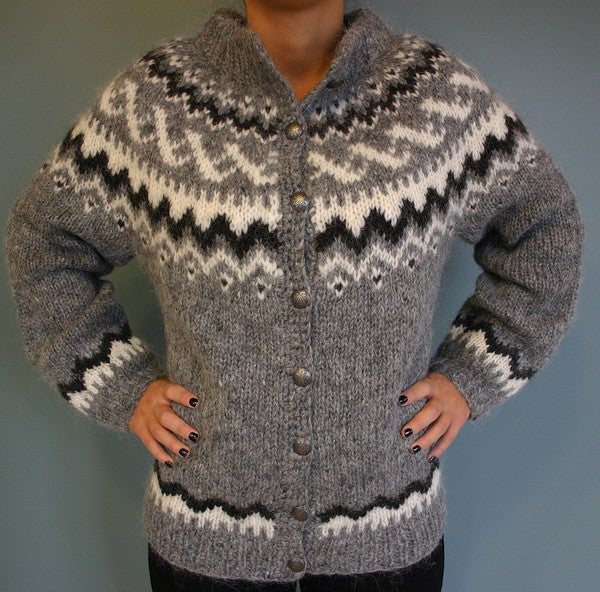 Grey hand knit cardigan from 100% Iceland wool yarn.