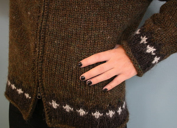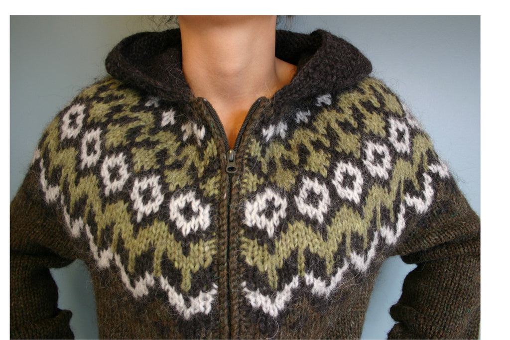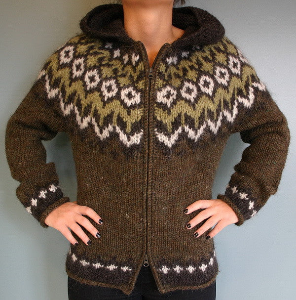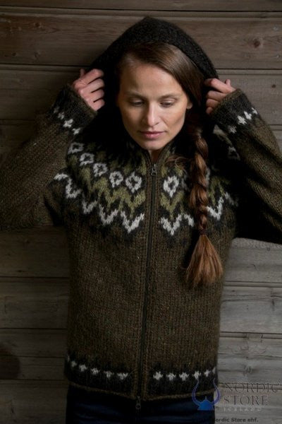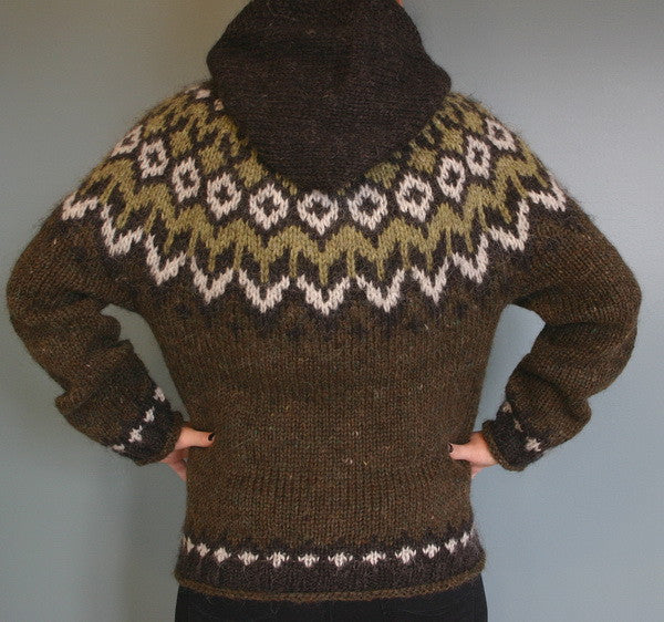 Traditional marsh heather Fishermen's wool cardigan with hood. Knit from Icelandic wool