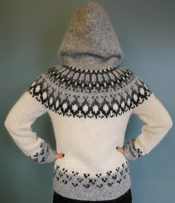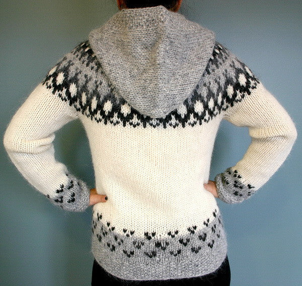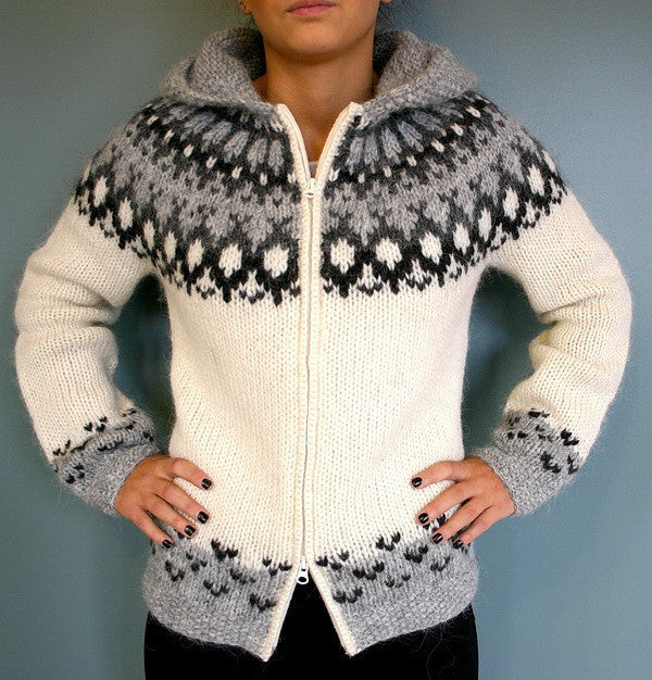 White wool cardigan with hood. Knitted from 100% Icelandic wool yarn.